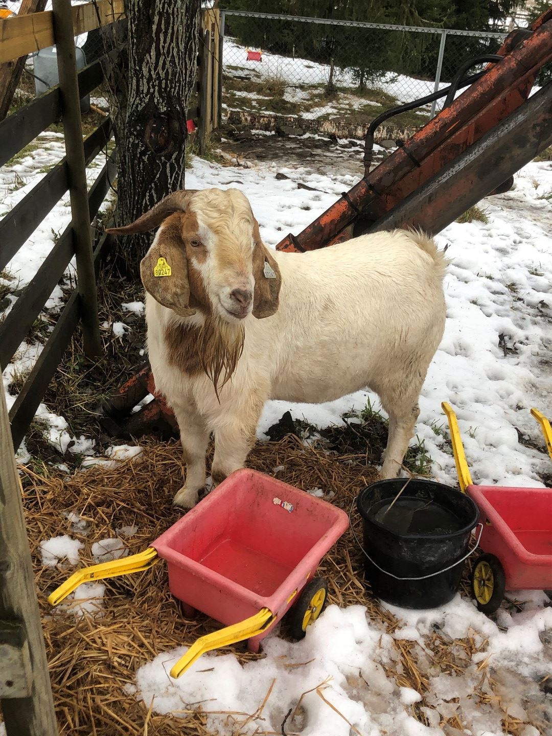 Nå har Bertha og Bodil fått besøk av Bruse. Geitene er drektige i 5 måneder.