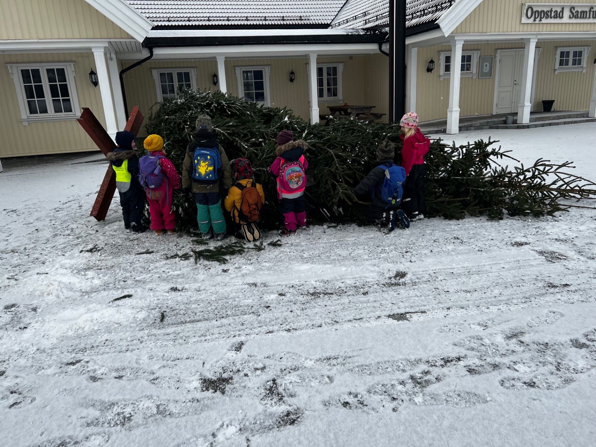 Julegrana til Oppstad samfunnshus ble i tradisjon tro hugget i lag med årets fålagruppe. Treet sto i hagen til familien Maciszka og barnehagedagen startet med frokost ute i hagen ved siden av treet.