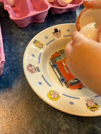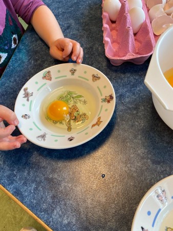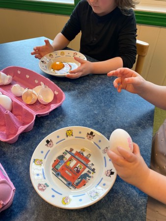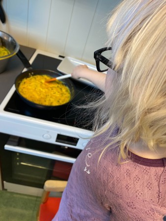 Forberedelser til GUL FROKOST. Her blir egg til eggerøre