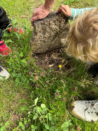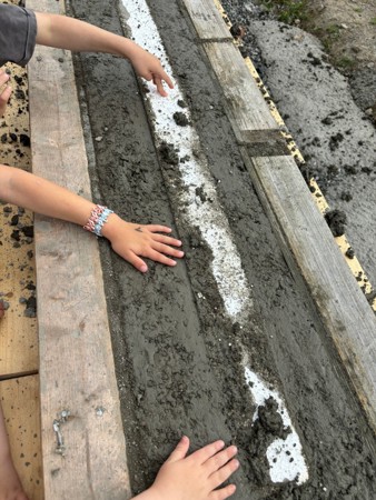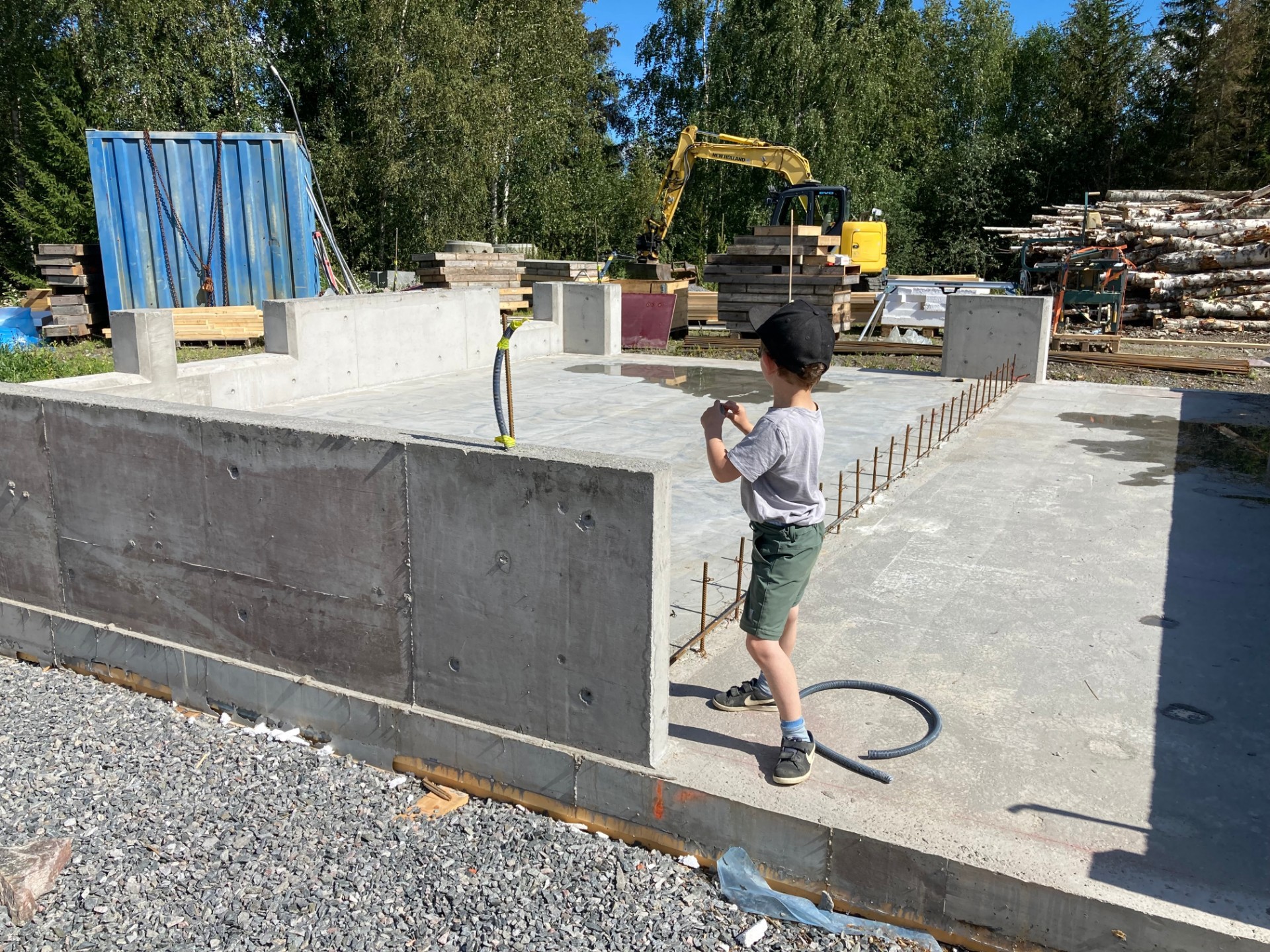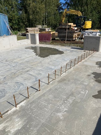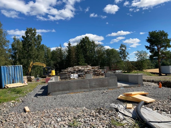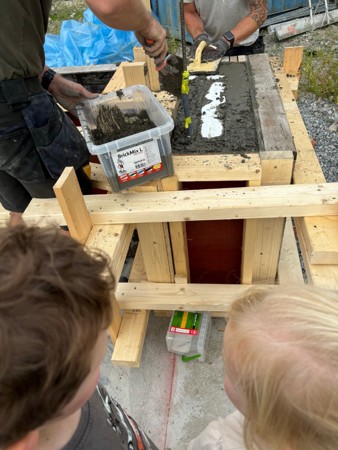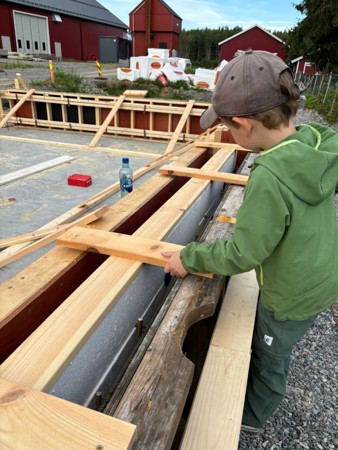 Byggingen av fjøset går fremover. Ord som armeringsnett, armeringsjern, isolasjon, grunnmur, betong, forskaling- (midlertidig konstruksjon som former fersk betong og holder den på plass til den blir hard) er uttrykk som er blitt benyttet ved turer til fjøstomta.
