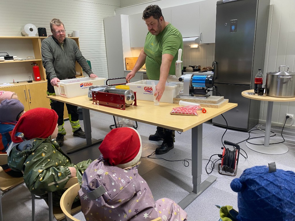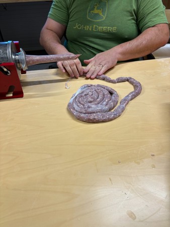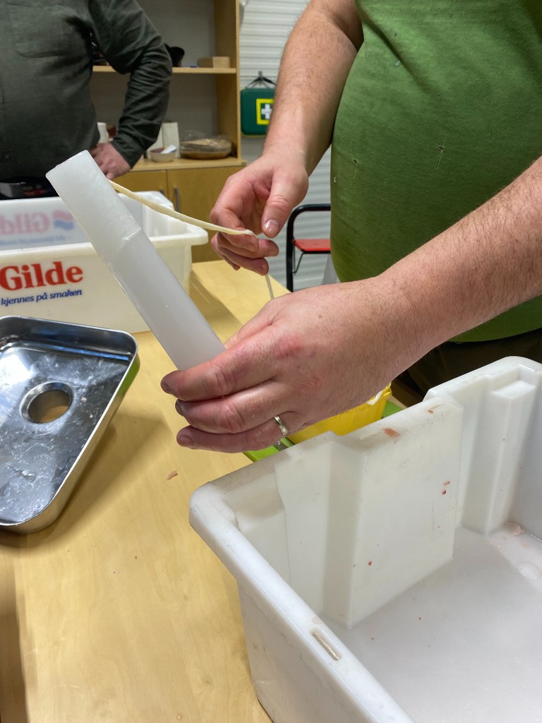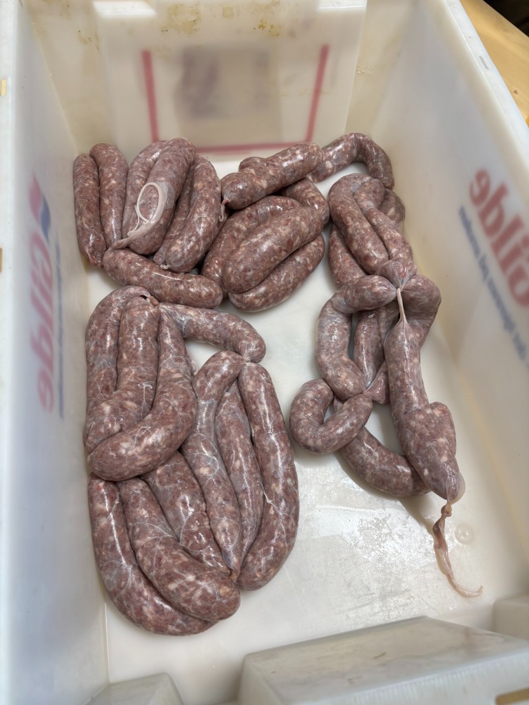 Noe foredling av grisen ble det, Harald og Russell har kvernet kjøtt og stappet pølser. En spennede prosess å delta på, og det ble noen meter med pølser