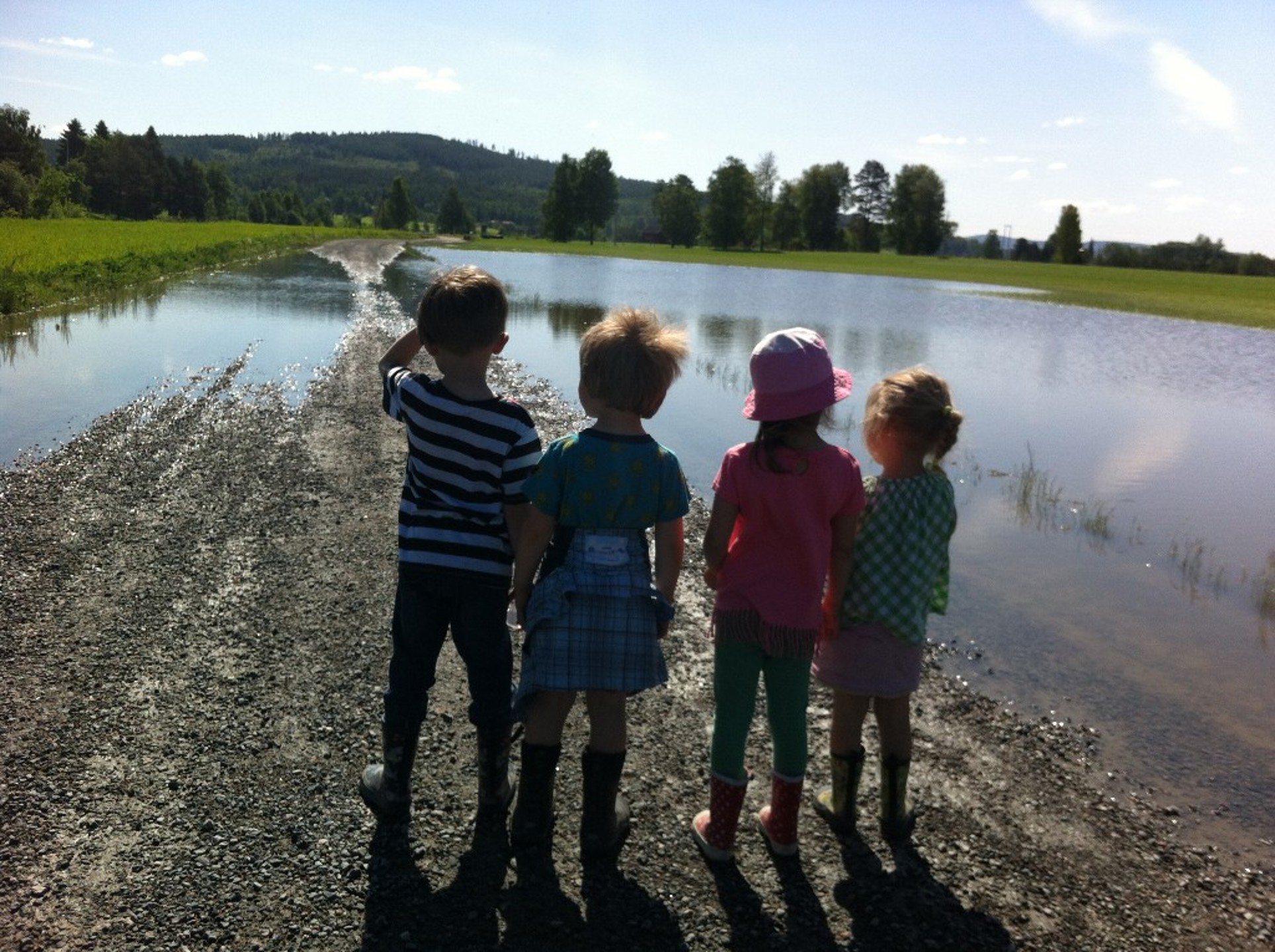 Flom har vært et stort tema de siste dagene hos oss. Lene har forklart og demonstrert hvordan flom oppstår i samlingsstund ved hjelp av sand, vann og et "hus" i en lekekasse. I tillegg har de eldste barna vært på observasjonsturer ned til stedet der veien har vært stengt i noen dager.