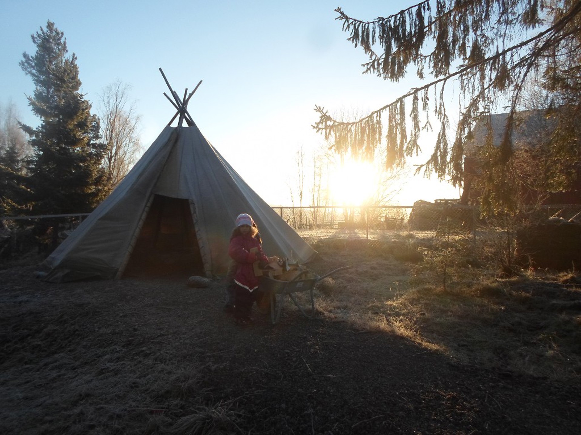 Vinter betyr kuldegrader, is og forhåpentligvis litt snø etterhvert. Klare, flotte soldager har vi hatt flere av og vi koser oss med fyr og matlaging i lavvoen. Det er viktig for oss at ungene får delta på våre daglige gjøremål og ser viktigheten av å jobbe sammen for fellesskapet. Det å hente og bære ved er noe ungene deltar på gjennom hele vinteren.