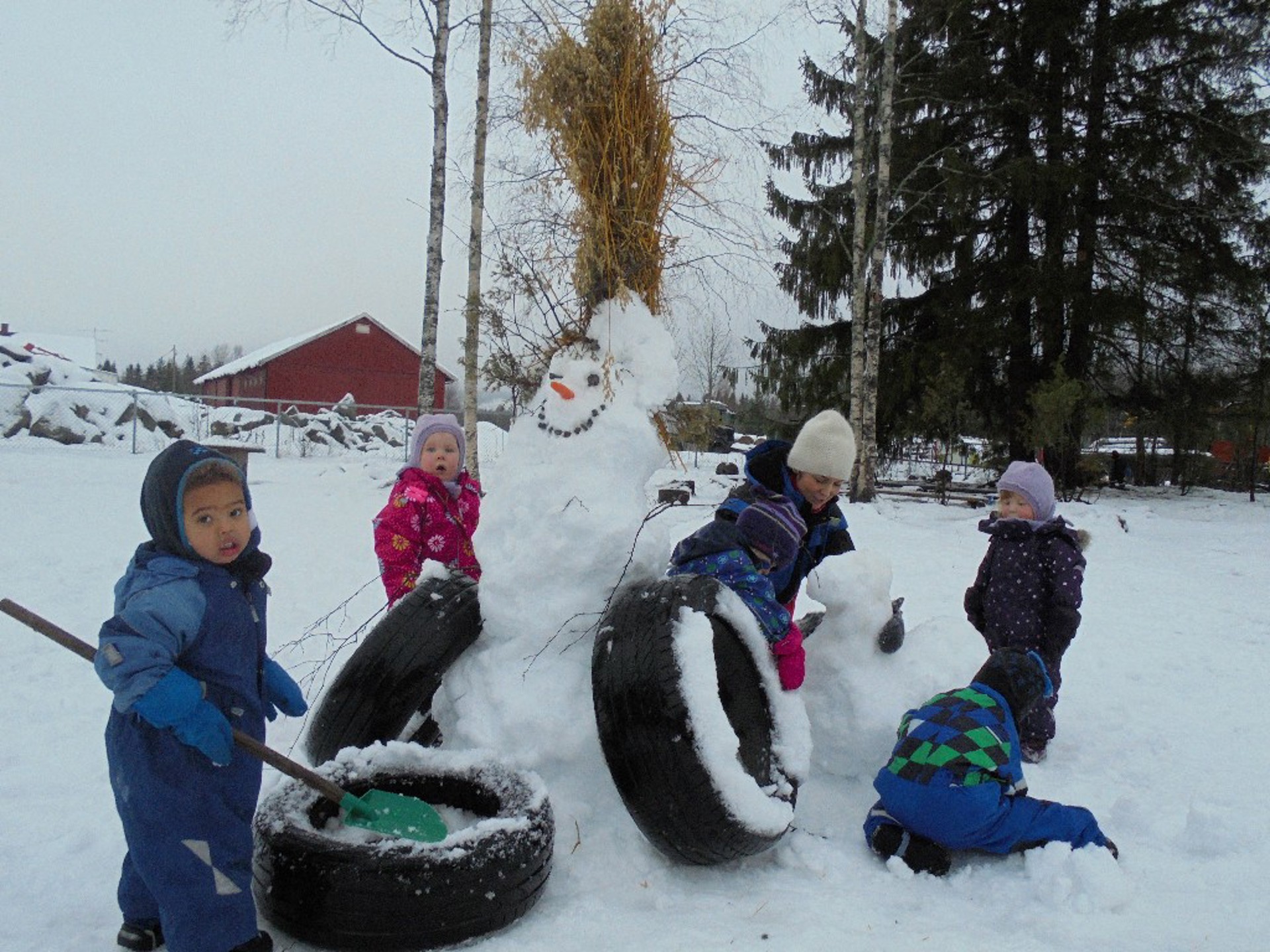Endelig har Kong Vinter banket på døra for fullt, og vi nyter snørike dager både innenfor gjerdet og på jordet og i skogen. Snø gir oss mange muligheter og vi har blant annet akt, gått på ski, laget snømenn, snøeseler og snøborg og gravd huler. Vi har også funnet "skøytebane" under isen. De store brøytetraktorene som suser forbi er også veldig spennende å observere!