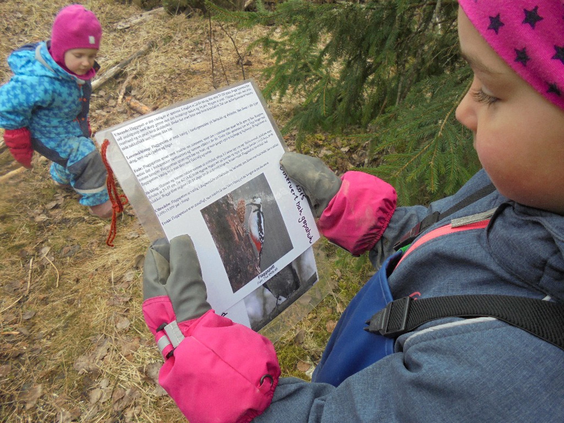 Flaggspetten var observert og hørt dagen før, og denne dagen tok Rakel, Elisabeth og en gruppe barn beina fatt over jordet. Målet var fugletitting og observasjon av treet der flaggspetten var sett. Vi fant hull i det gamle treet og fersk fuglemøkk, men ingen flaggpett i sikte. Vi lærte at flaggspetten legger egg i starten av mai, og hos flaggspettene så ruger både hunnene og hannene. "Ikke som høna!" som et barn kommenterte.