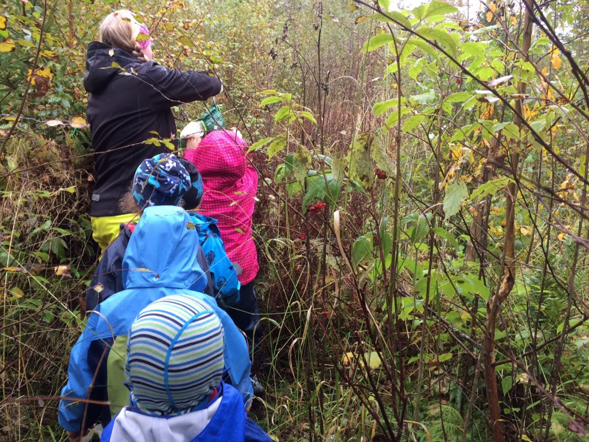 En tur i gapahuken ble til en oppdagelsesferd i jungelen denne uka. Vi tok turen forbi tjennet og inn i myra og skogen bak gapahuken. Dere kan tro vi møtte mange hindere og skumle dyr på veien! En sump, trær som hadde veltet, et yrende fugleliv, et gjerde som måtte forseres og noen rare jungelbærbusker så vi på ferden.