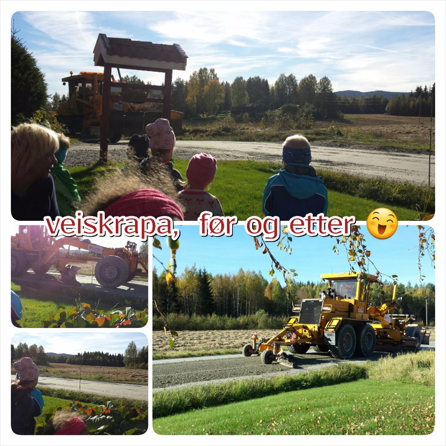 Veiskrapa før og etter! Hva gjør en veiskrape egentlig? Jodda, den fyller i hulllene i veien og gjør slik at veien blir bedre og kjøre på. Og av og til kommer det et lass med grus som veiskrapa (eller vægaskrapa som noen sier) hjelper til å jevne ut.