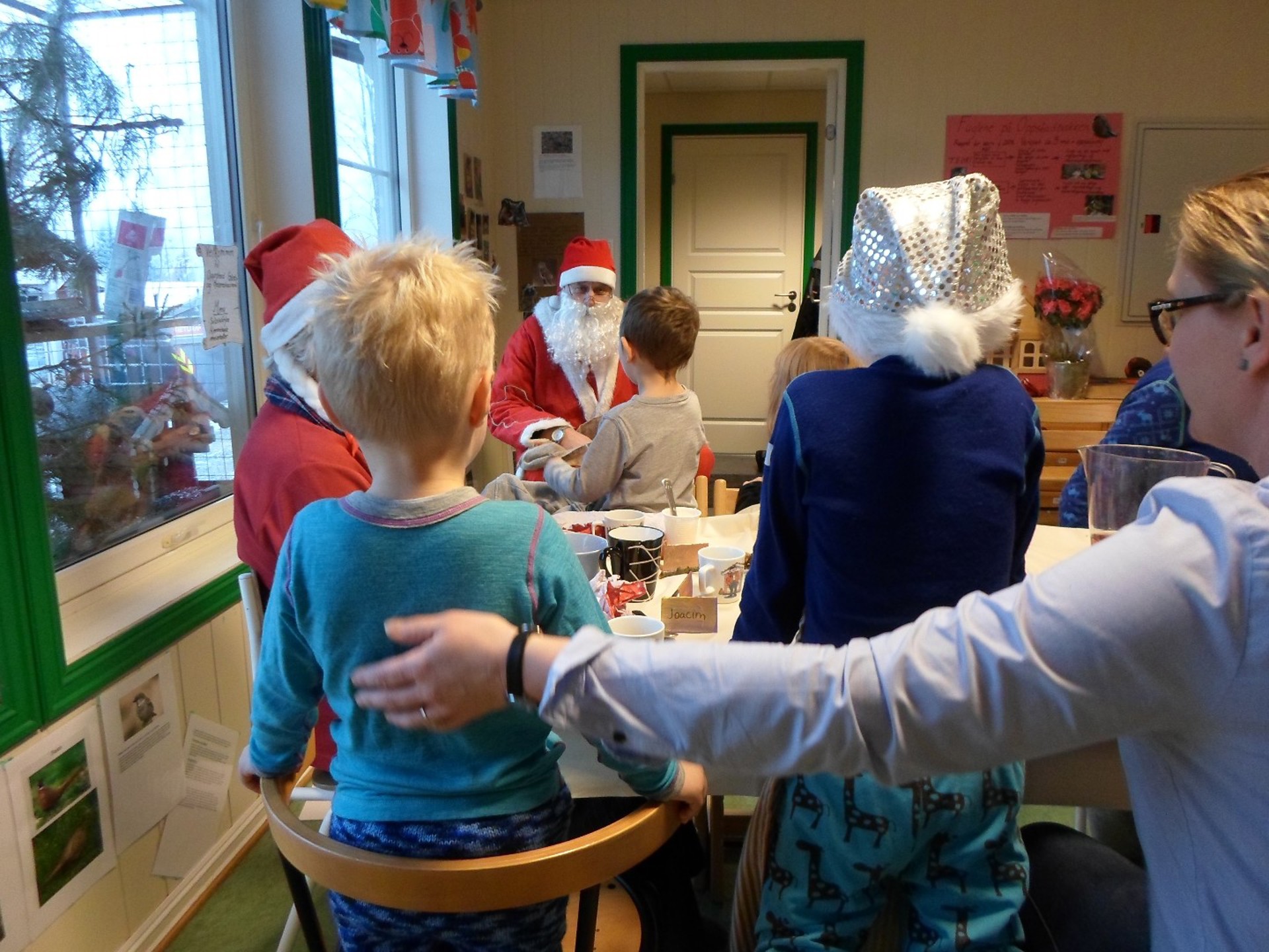 Vi kom inn til dekket bord, fint pyntet med bordkort, kongler, duk og servietter. Fålane hjalp til å servere oss maten. Til dessert ble det riskrem og rød saus. Og mens vi spiste riskremen vår så kom jammen nissen på besøk! Han tok seg god tid og gikk rundt bordet og ga alle barna poser med noe godt oppi. Vi sang to sanger for ham; På låven sitter nissen og Oppstad-sangen vår. Han fikk også smake på riskremen vår, det syntes han var kjempegodt.