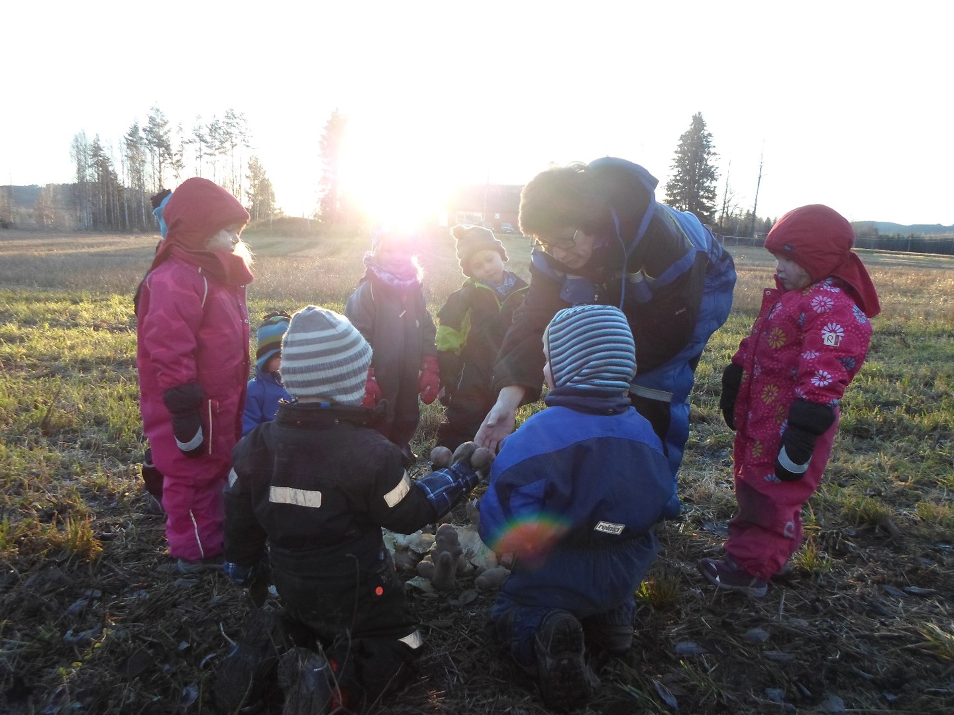 Mat kan være vanskelig å finne for dyra om vinteren, og da er det godt at vi i barnehagen kan hjelpe til! Ingen snø enda, men mat er godt i magen uansett for skogens dyr. Vi har lagt ut poteter til rådyra på jordet bort mot gapahuken. Vi håper vi får se rådyra på nært hold da de koser seg med poteter.