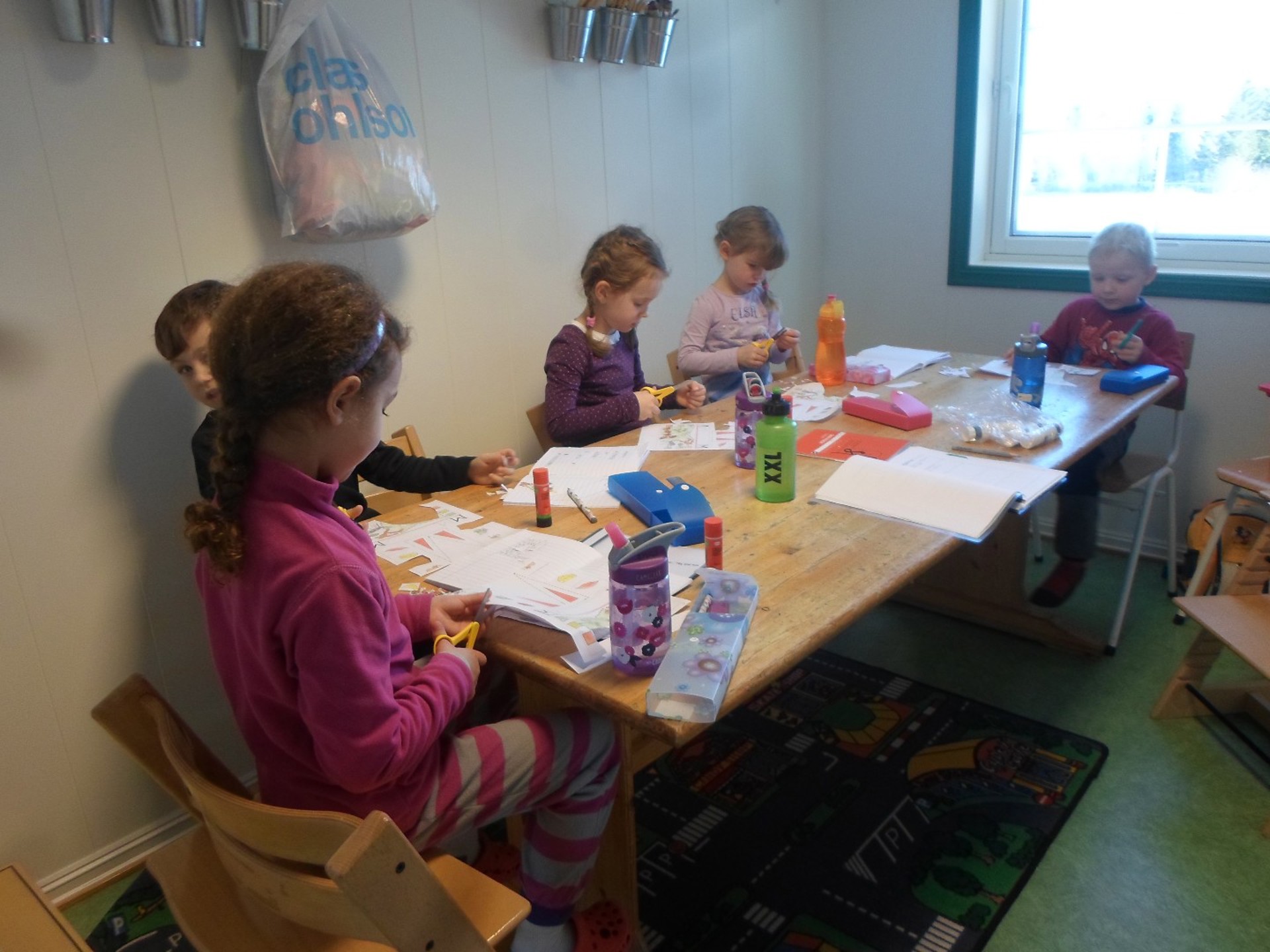Denne dagen var det bokstaven M klubben jobbet med; klibb og lim og gjenkjenning av former, bokstaver og ord på M.