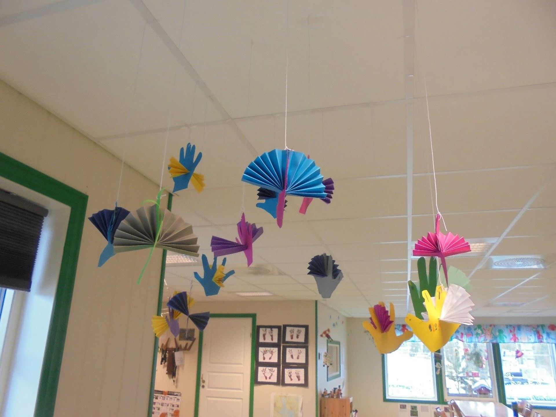 Fugler er i fokus hele året hos oss. Her har vi laget fugler av håndavtrykk, samt dagens registrering av fugler i meiserestauranten.