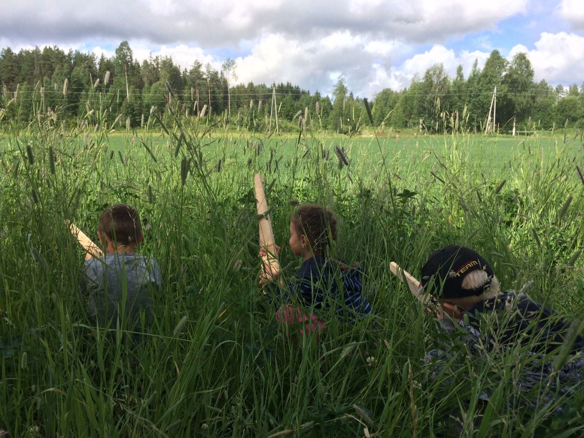 Nye jegere tok plass i enga og smøg seg sakte frem i leken på jakt etter bjørn og ulv. Dagen har også inneholdt blomsterplukking, blad og insektsstudier og vi har også tatt åkeren i nærmere øyesyn - den har det skjedd mye med siden sist.