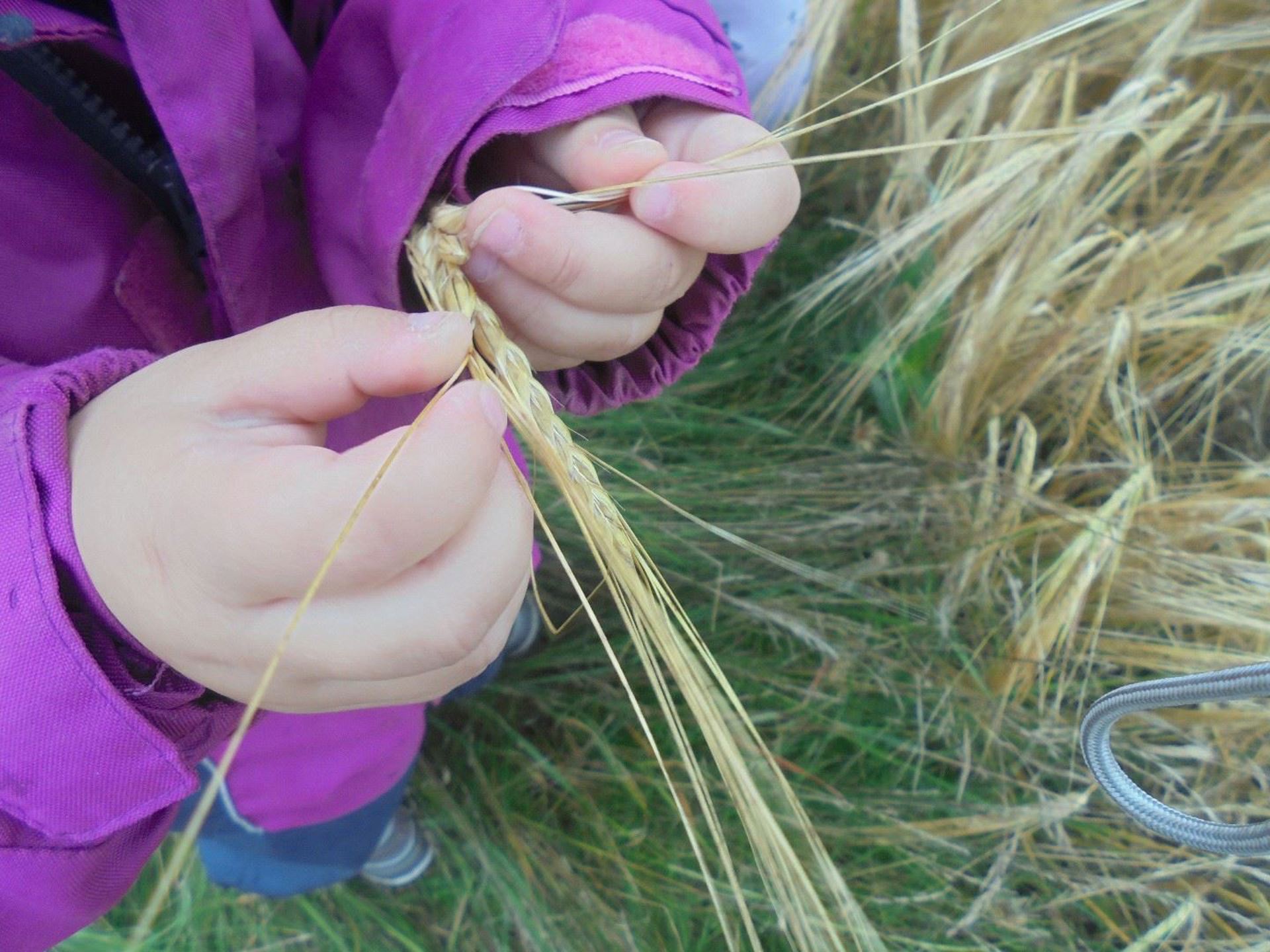 Vi har også vært på tur for å se på hveiten og bygget som vokser i umiddelbar nærhet til barnehagen. De ser forskjellig ut, smaker litt forskjellig og det er spennende å se på forskjellen på snerp og korn. Fullkorn er et eget begrep som vi også snakket om på vår vei.