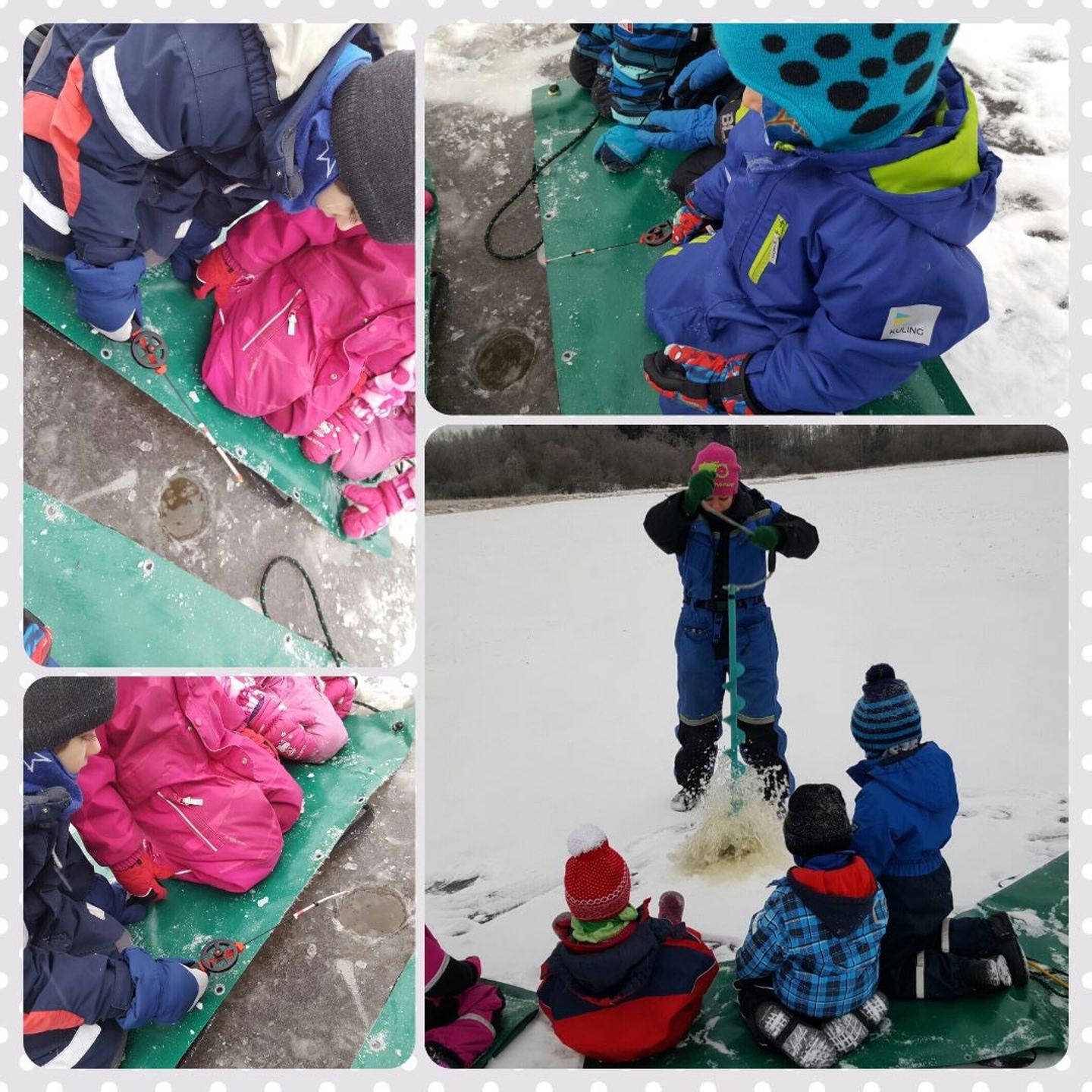Når vi omsider kom ned til tjennet ble sikkerheten på isen et tema. vi delte oss i grupper og så på at hull ble boret og deretter gjorde oss klar til pilking.