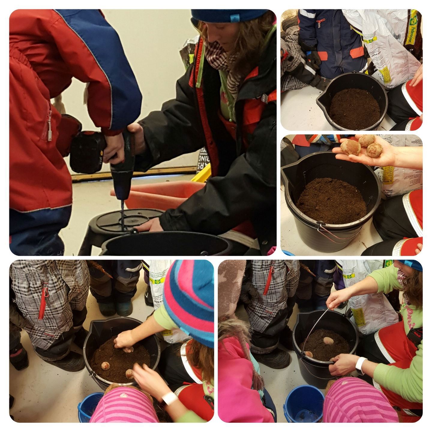 I dag har vi satt de første potetene i en bøtte vi sjøl har laget. Vi boret hull for at poteten ikke skal stå i vatn samtidig la vi litt grus for å kunne ha et lite lager med vatn.