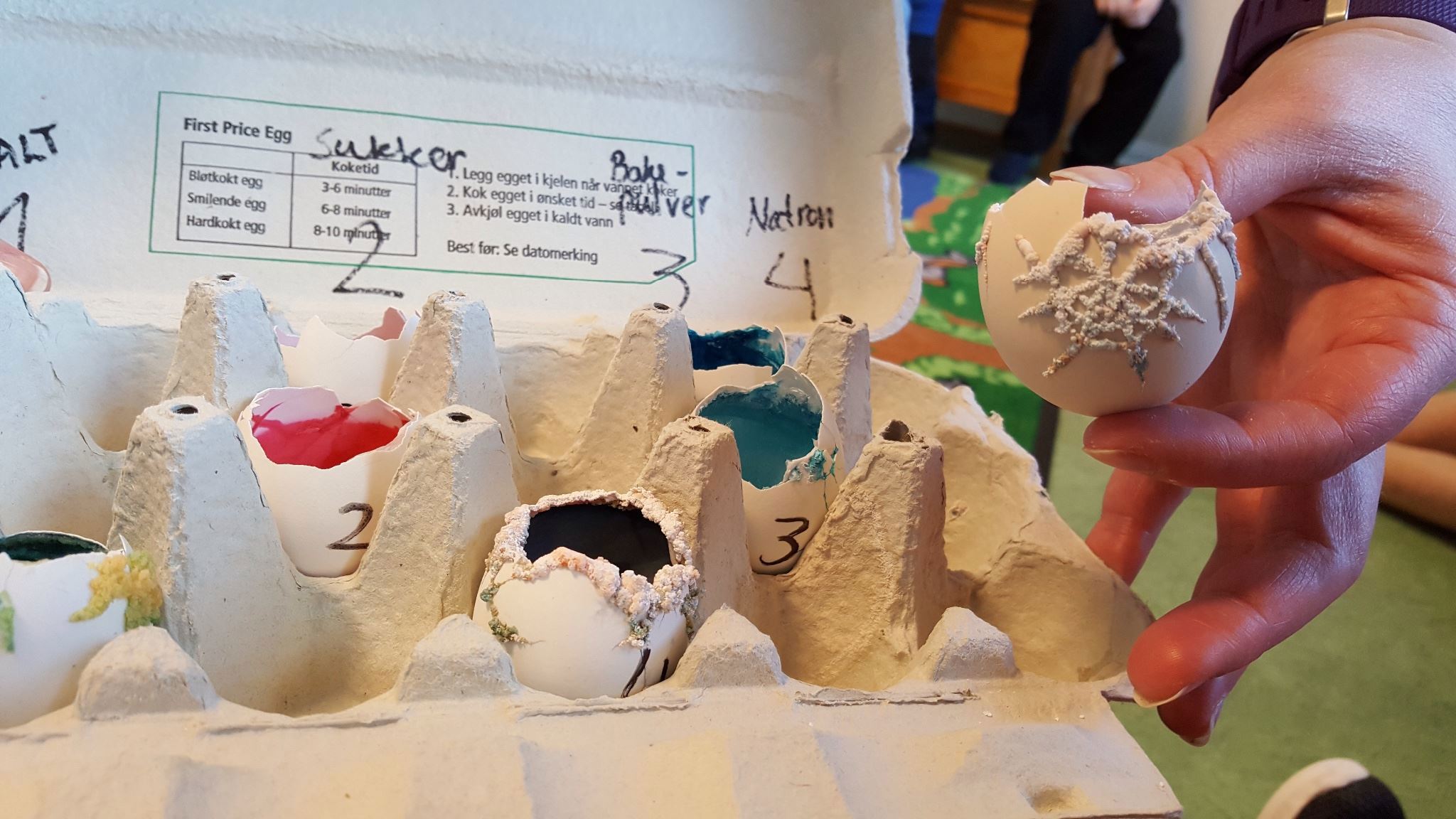 På dette bildet viser egget med bakepulverblanding der det har utviklet seg litt krystaller men også noe har tørket ut.