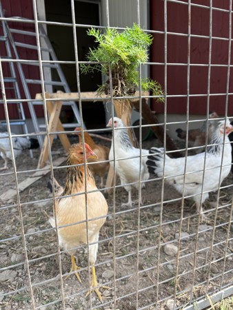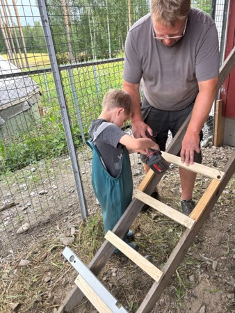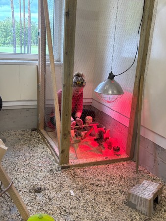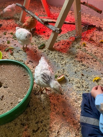 Barna er med i fjøset og hjelper til å plukke egg og passe på at hønene har det bra. Om sommeren åpnes luken i veggen slik at høner/ haner kan fritt velge om de vil gå ute eller inne i hverdagen.